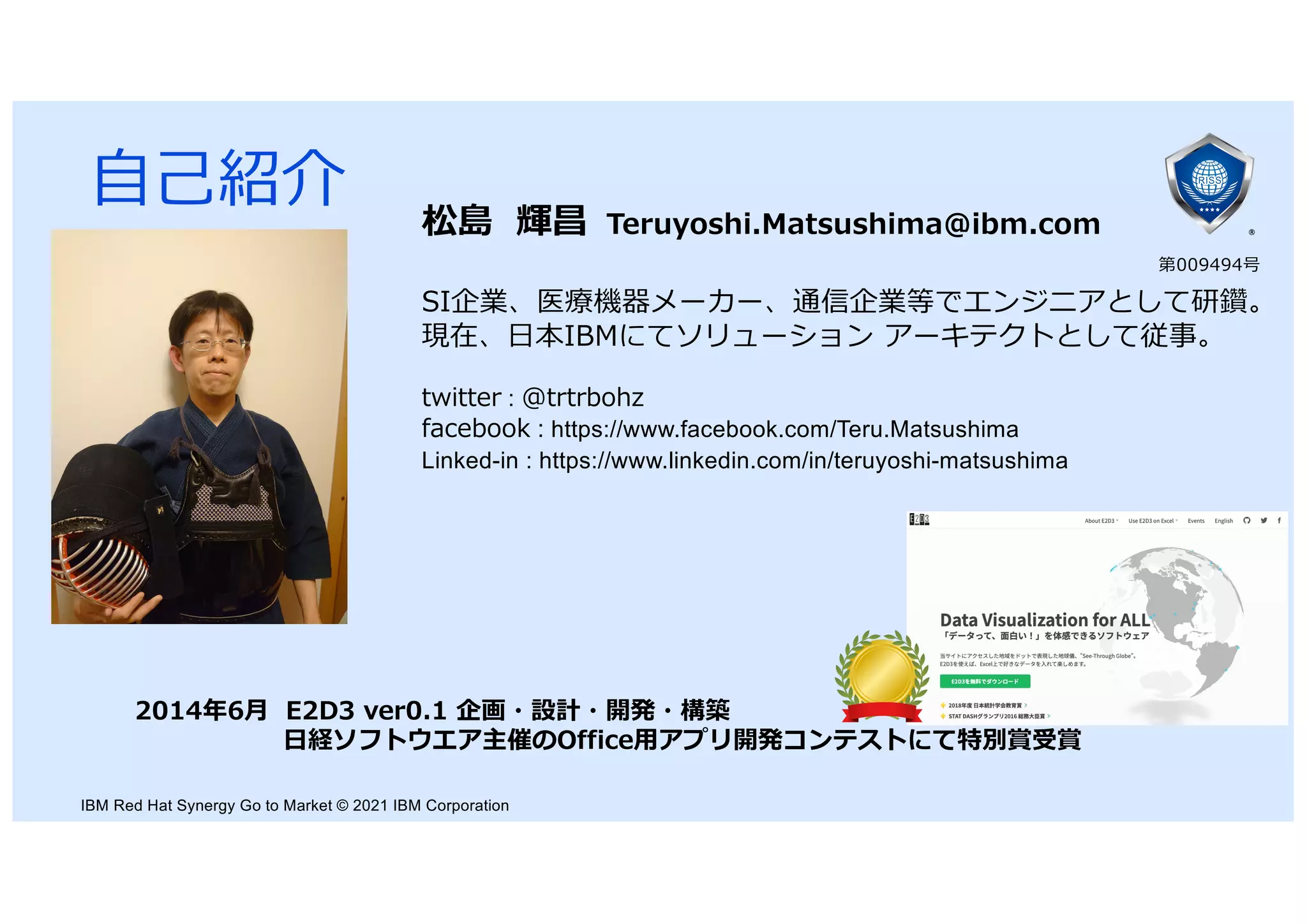 アーキテクトとして従事。 twitter : @trtrbohz facebook : https://www.facebook.com/Teru.Matsushima Linked-in : https://www.linkedin.com/in/teruyoshi-matsushima 2014年6⽉ E2D3 ver0.1 企画・設計・開発・構築 ⽇経ソフトウエア主催のOffice⽤アプリ開発コンテストにて特別賞受賞 第009494号 IBM Red Hat Synergy Go to Market © 2021 IBM Corporation ⾃⼰紹介