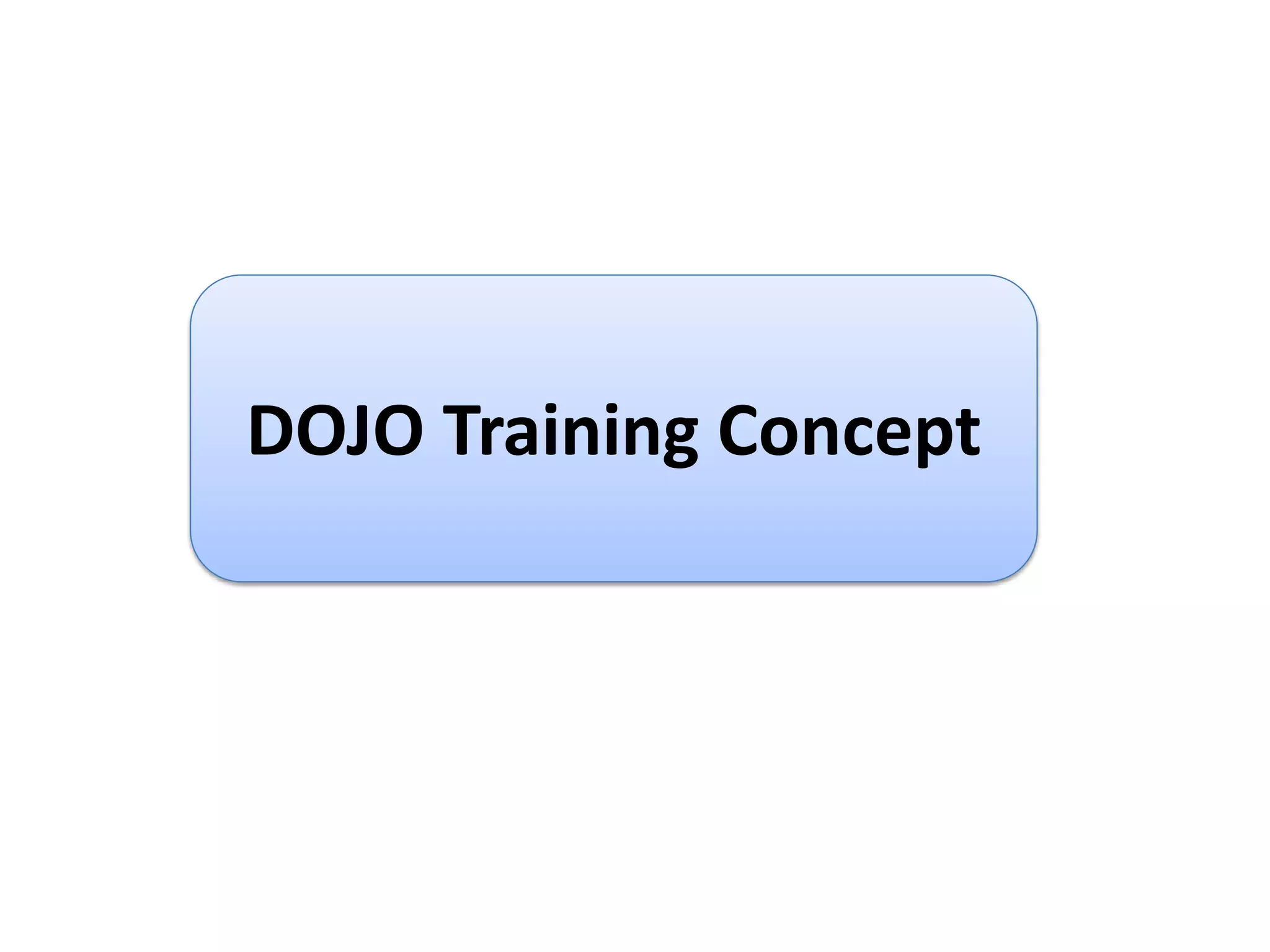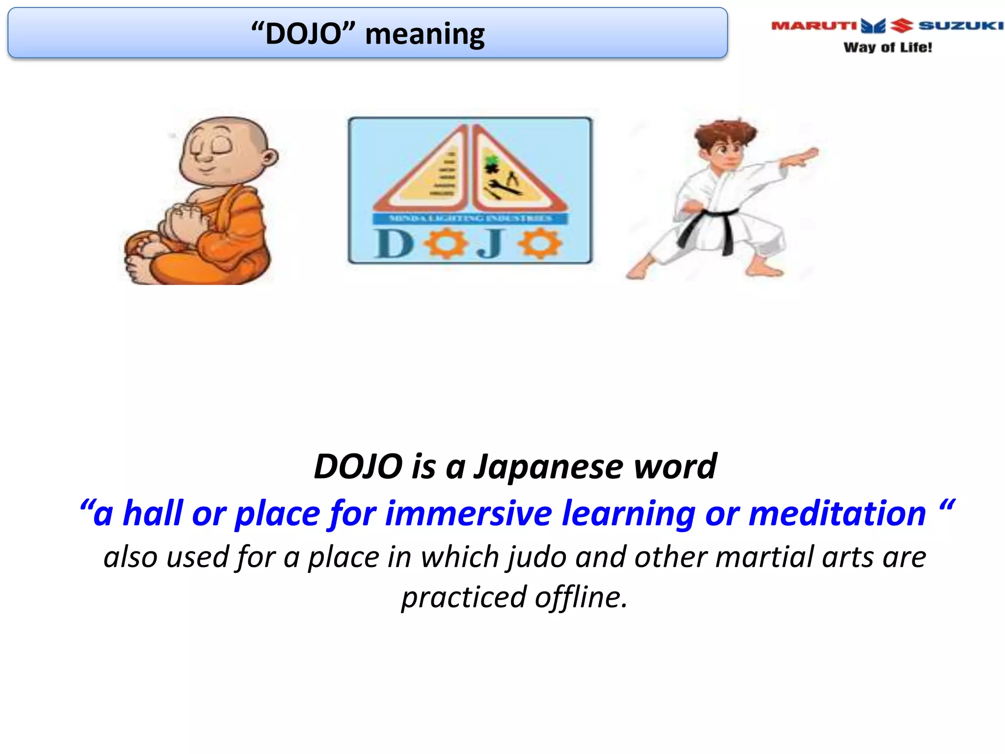 The document discusses DOJO training, which is an offline practical training concept used to train new and existing employees. It involves a systematic 8 step process conducted in a simulated work environment. The steps include safety training, behavioral training, product knowledge training, production rule training, and process training. Trainees learn skills through simulators and practice before working on the actual shop floor under supervision. The goal is to reduce accidents and defects by ensuring employees are thoroughly trained and ready for their job responsibilities through this immersive offline practical training approach.