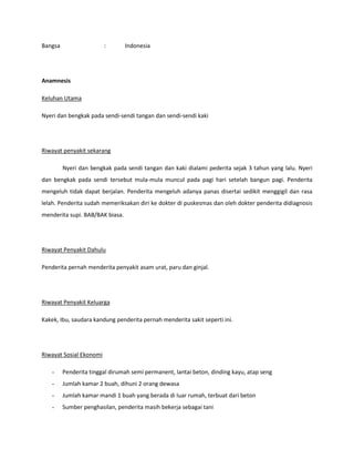 Dokumen tersebut merupakan laporan kunjungan rumah (home visite) oleh dokter keluarga kepada pasien bernama Tn. RK yang didiagnosis menderita gouty artritis kronis. Laporan mendokumentasikan identitas pasien, keluhan utama, riwayat penyakit, pemeriksaan fisik, diagnosa, dan tindakan yang diberikan untuk mengontrol kondisi pasien. Home visite penting untuk mengevaluasi pola hidup pasien dan memberikan eduk