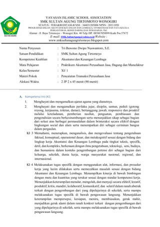 Dokumen ini merinci rencana pembelajaran mata pelajaran akuntansi dengan fokus pada pencatatan transaksi perusahaan jasa, disusun oleh Tri Buwono D. Nuswantoro di SMK Sultan Agung Tirtomoyo. Pembelajaran mencakup analisis dokumen sumber dan pendukung, serta metode pengajaran seperti problem-based learning dan diskusi. Tujuan utamanya adalah agar siswa mampu menganalisa dan mengklasifikasikan dokumen yang relevan dalam konteks perusahaan jasa.