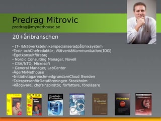 Halvdags workshop om samverkan i molnet, specifikt Google Apps. Genomgång av IT-histora, molnet och grunderna för samverkan. Praktiskt genomgång av Google Apps för Admin och Användare.