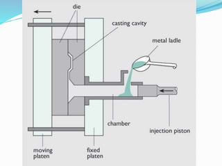 Shell moulding involves coating a heated metal pattern with a thermosetting resin and sand mixture to form a shell around it. When the shell is removed, it can be used like a mold cavity. The moulding sand is a mixture of quartz sand and bakelite, coated using cold or hot coating methods. Shell moulding allows for complex parts with good tolerances and surface finish. Investment casting uses wax or plastic patterns coated with refractory material and then melted out before pouring metal. It produces parts with tight tolerances and surface finishes of 1.2–3 μm. Die casting injects molten metal into metal dies under high pressure. It results in very smooth surfaces, accuracy, and mechanical properties,
