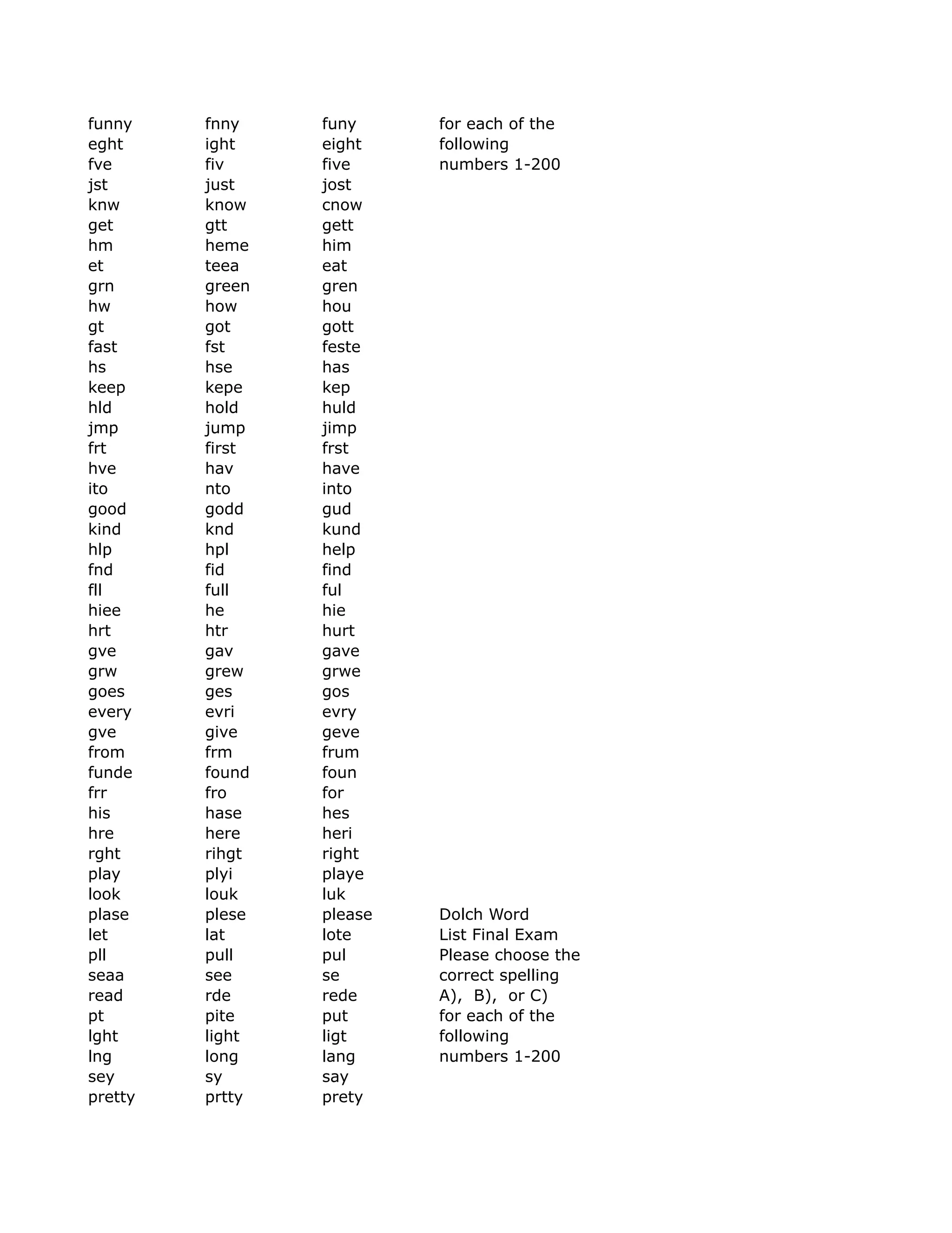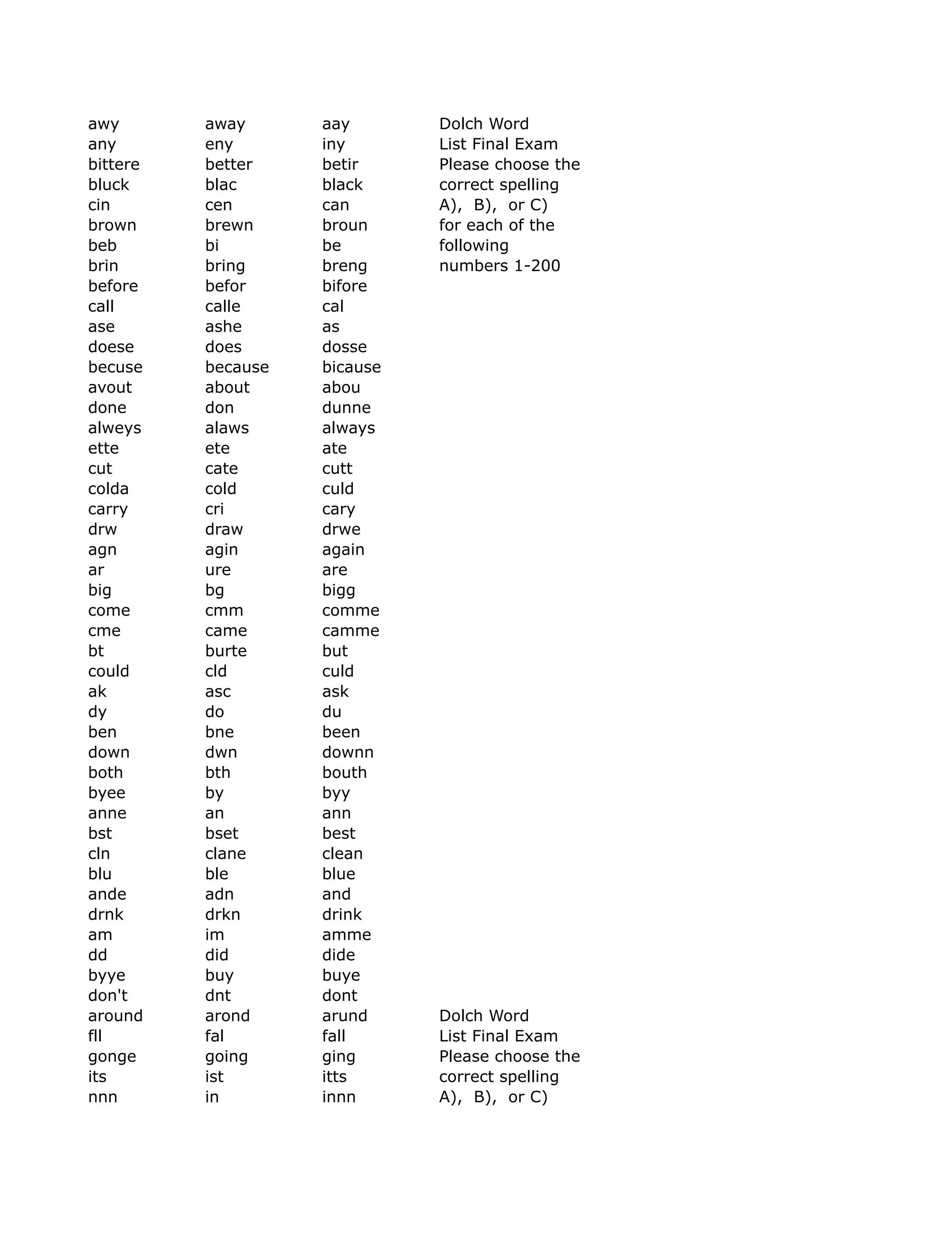 This document appears to be a list of 200 commonly misspelled words along with their potential misspellings. The purpose seems to be for a student to choose the correct spelling of each word from options A), B), or C).