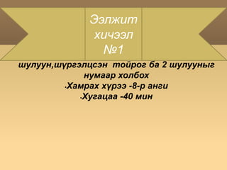 Хугацаа -40 минХичээлийнарга зүй : Уламжлалт арга Хичээлийн эрэмбэСэдэлжүүлэлт – 3 Шинэ мэдлэг эзэмших - 15Дадлага – 20 ҮнэлгээГэрийн даалгавар - 2 - 5.