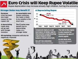 The document discusses the recent depreciation of the Indian rupee against the US dollar. It notes that the rupee has fallen close to 22% against the dollar in the past year. Several factors are contributing to the rupee's decline, including a high current account deficit, lack of foreign investment, global economic uncertainties, and domestic political issues. The depreciating rupee increases costs for imports and foreign education/travel, fueling inflation. While exporters may benefit initially, a weak rupee ultimately hurts the broader economy. Policy reforms and increased foreign investment are suggested to stabilize the currency.