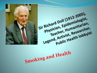 This document discusses Sir Richard Doll's landmark case-control studies from 1950 and 1990 that linked smoking to lung cancer. The 1950 study compared hospital patients with and without lung cancer and found heavy smokers were 50 times more likely to develop lung cancer. Subsequent national trends in the UK showed smoking rates halved between 1950-1990, while lung cancer rates fell more sharply, indicating risk declined for continuing smokers. However, those still smoking in 1990 had higher risks due to persistent smoking. The study concluded that stopping smoking, even in middle age, significantly reduces lung cancer risks, and stopping before middle age avoids over 90% of tobacco-related risk.