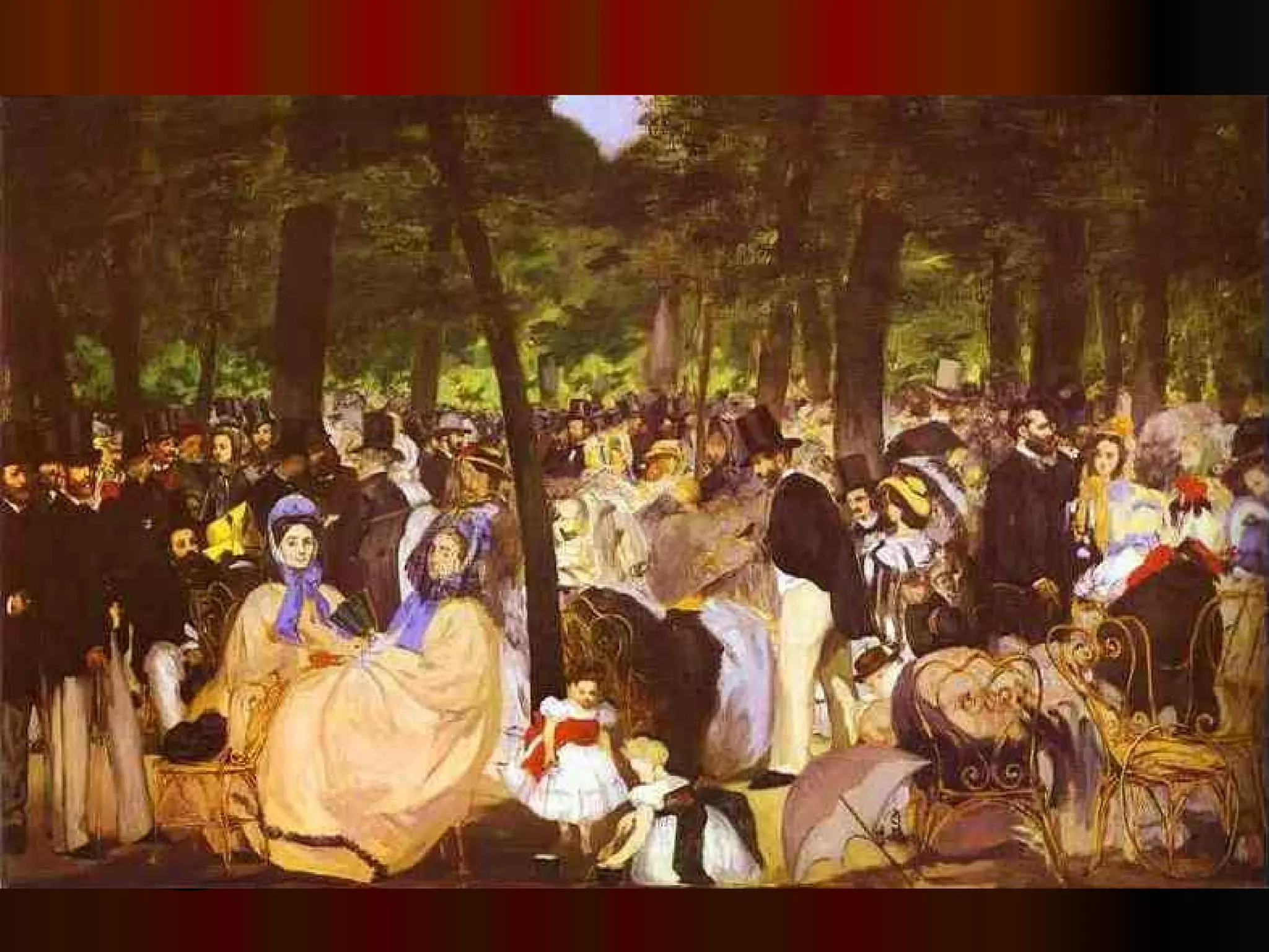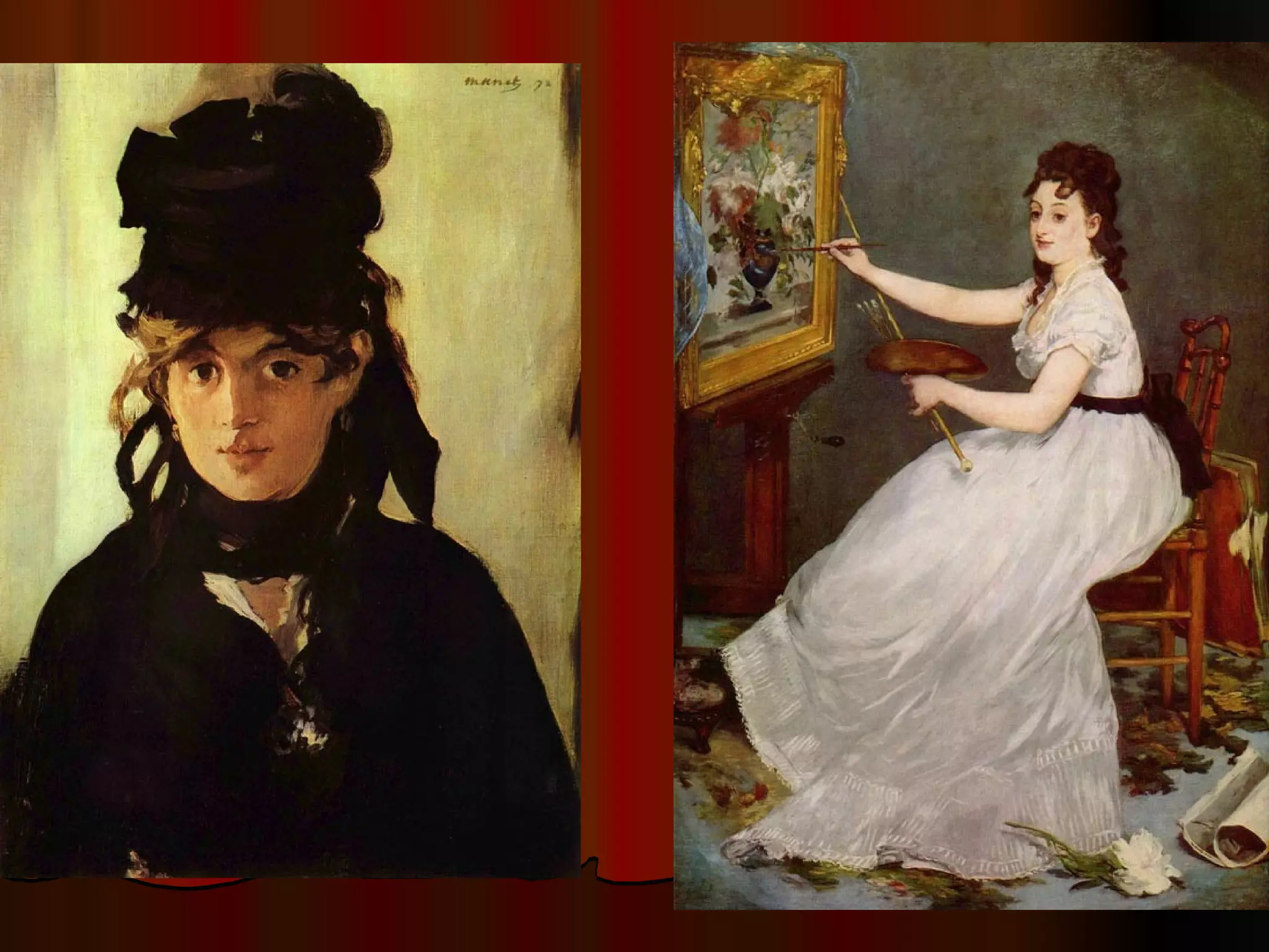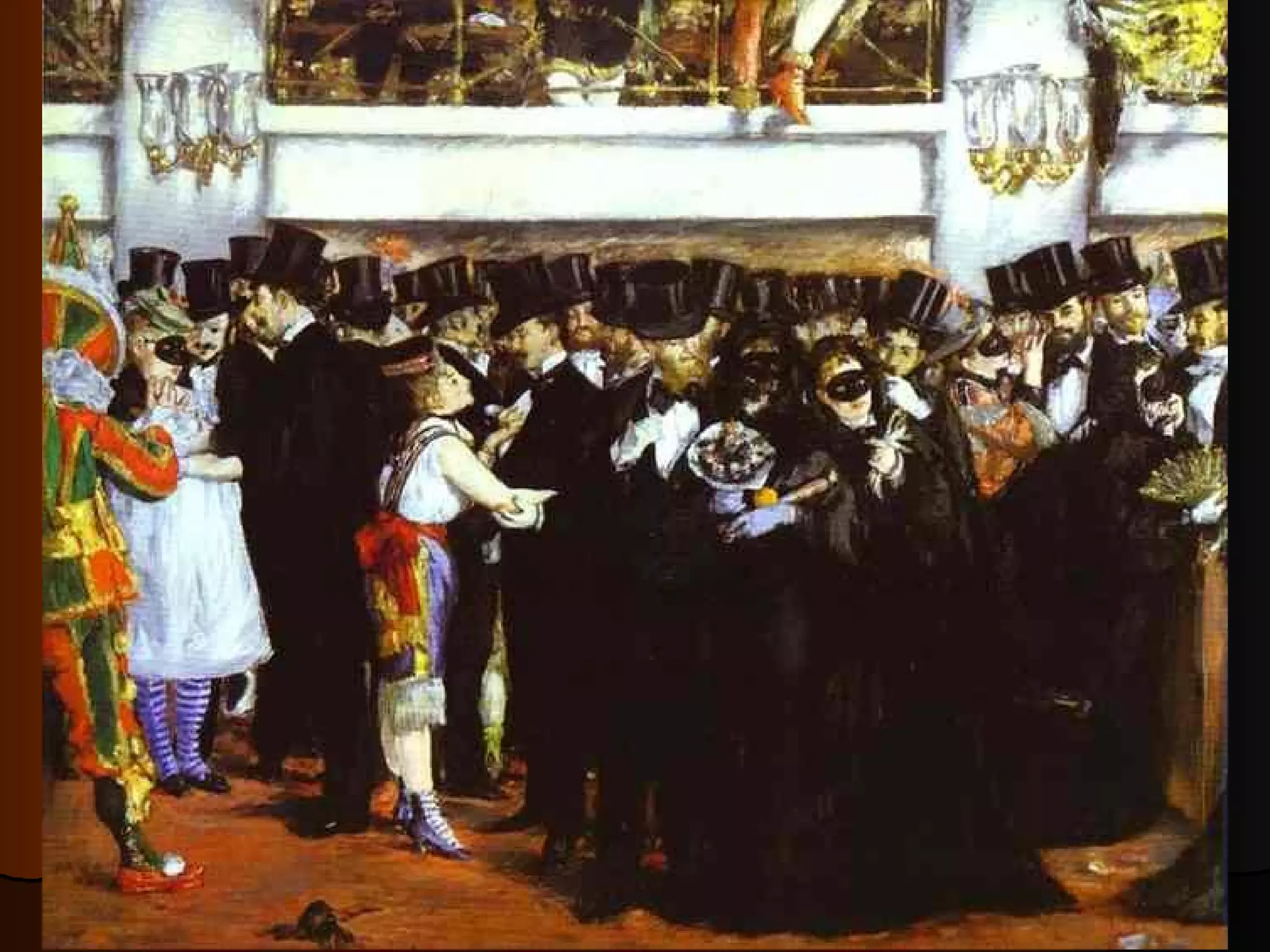 Edouard Manet was a French painter who lived in the 19th century. He was known for his self-portraits and plein air style of painting outdoors. The document discusses Manet's life, art, parents, wife Suzanne Leenhoff, and friends.