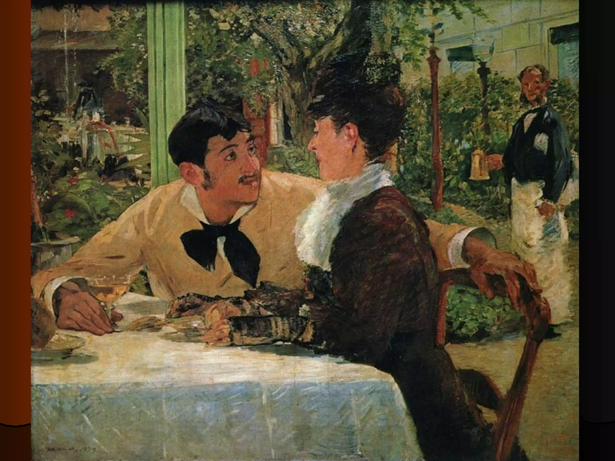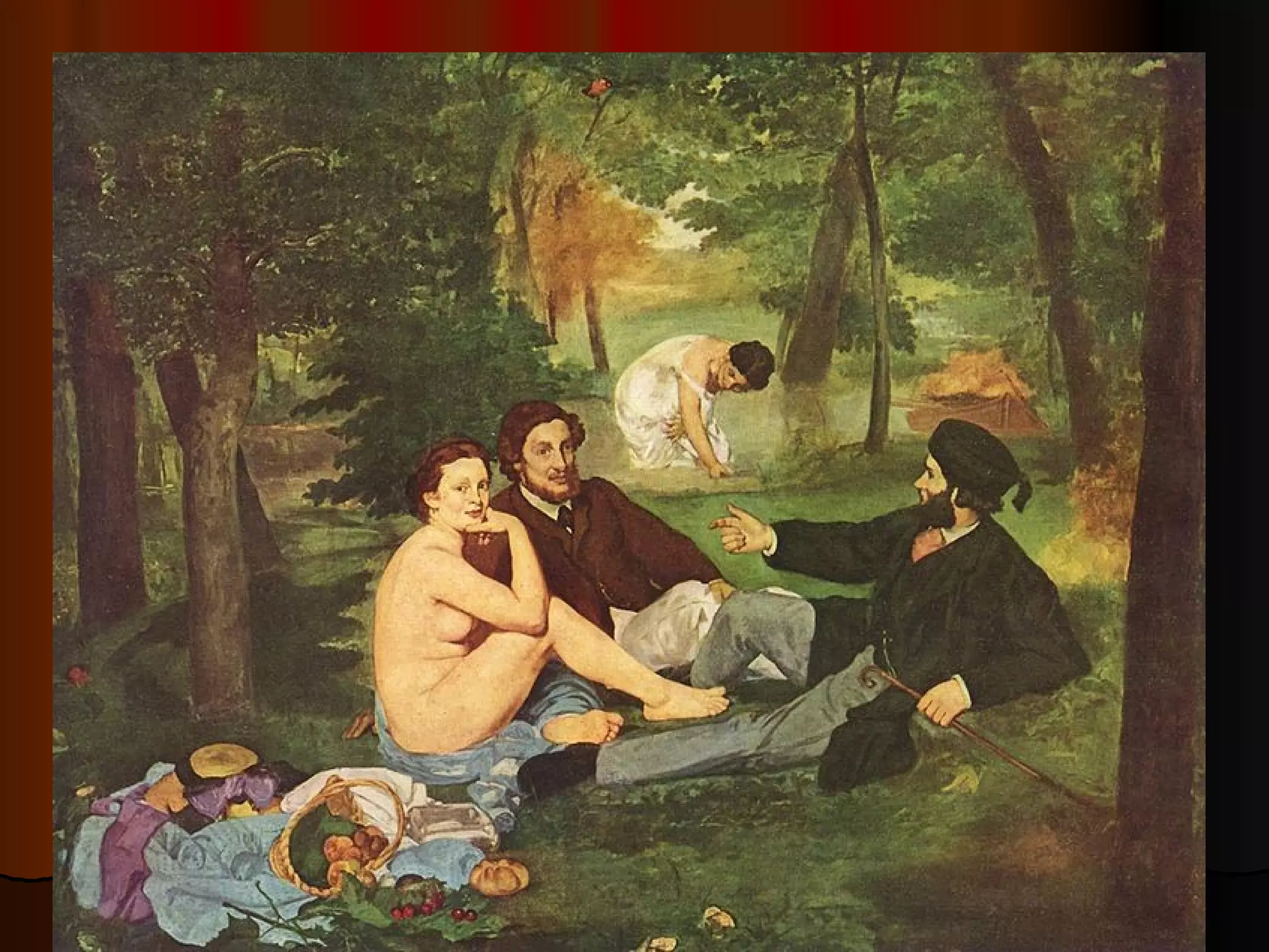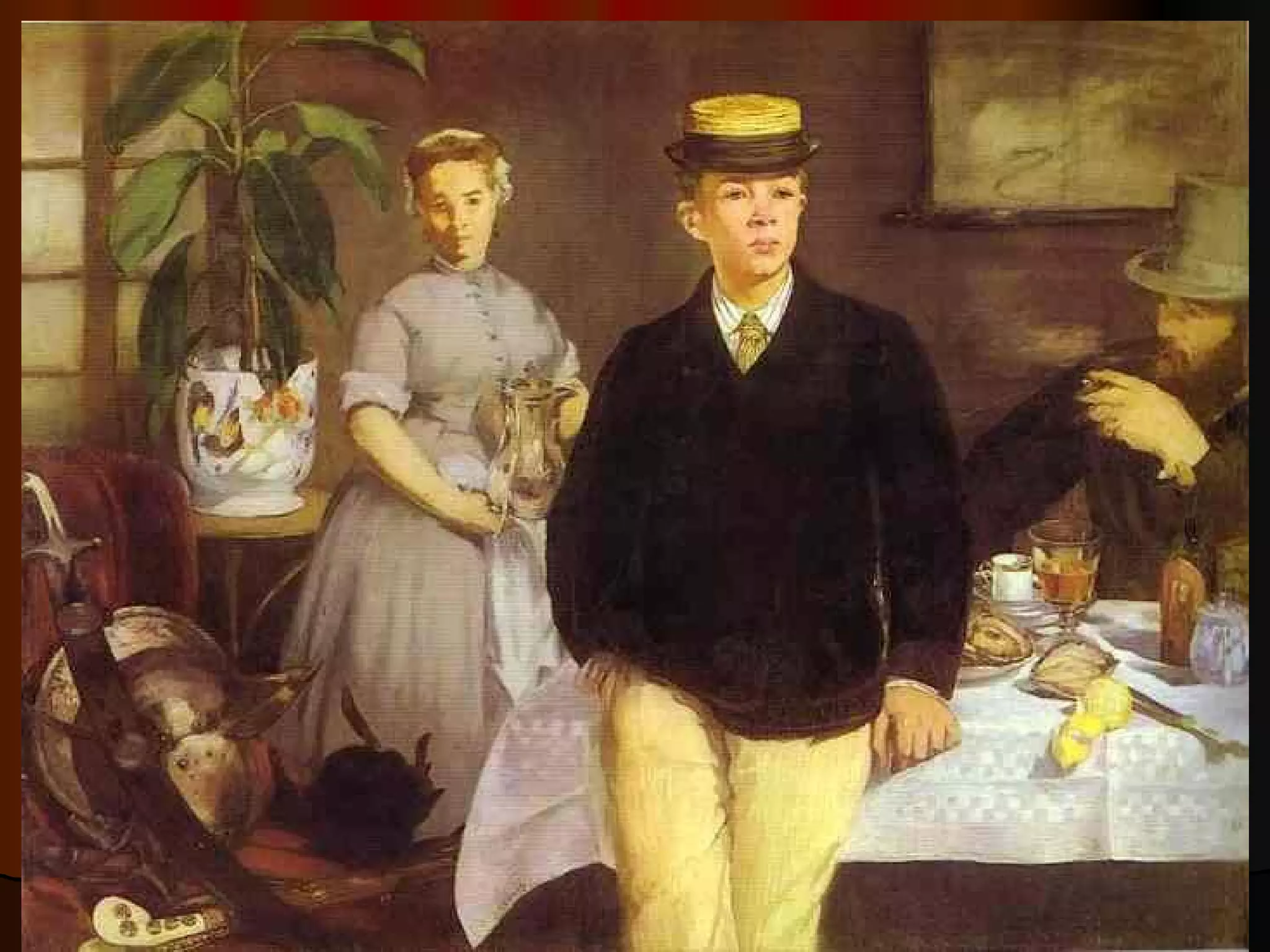 Edouard Manet was a French painter who lived in the 19th century. He was known for his self-portraits and plein air style of painting outdoors. The document discusses Manet's life, art, parents, wife Suzanne Leenhoff, and friends.