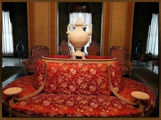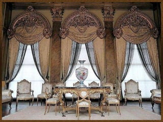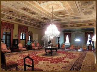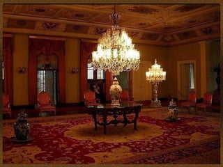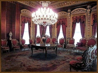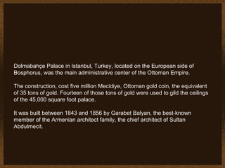 Dolmabahçe Palace in Istanbul, Turkey was the main administrative center of the Ottoman Empire from 1856 until 1923. It was built between 1843 and 1856 at a cost of five million gold coins, with fourteen tons of gold used to gild the ceilings. The palace housed six Sultans and featured the world's largest Bohemian crystal chandelier, weighing 4.5 tons with 750 lights, a gift from Queen Victoria.