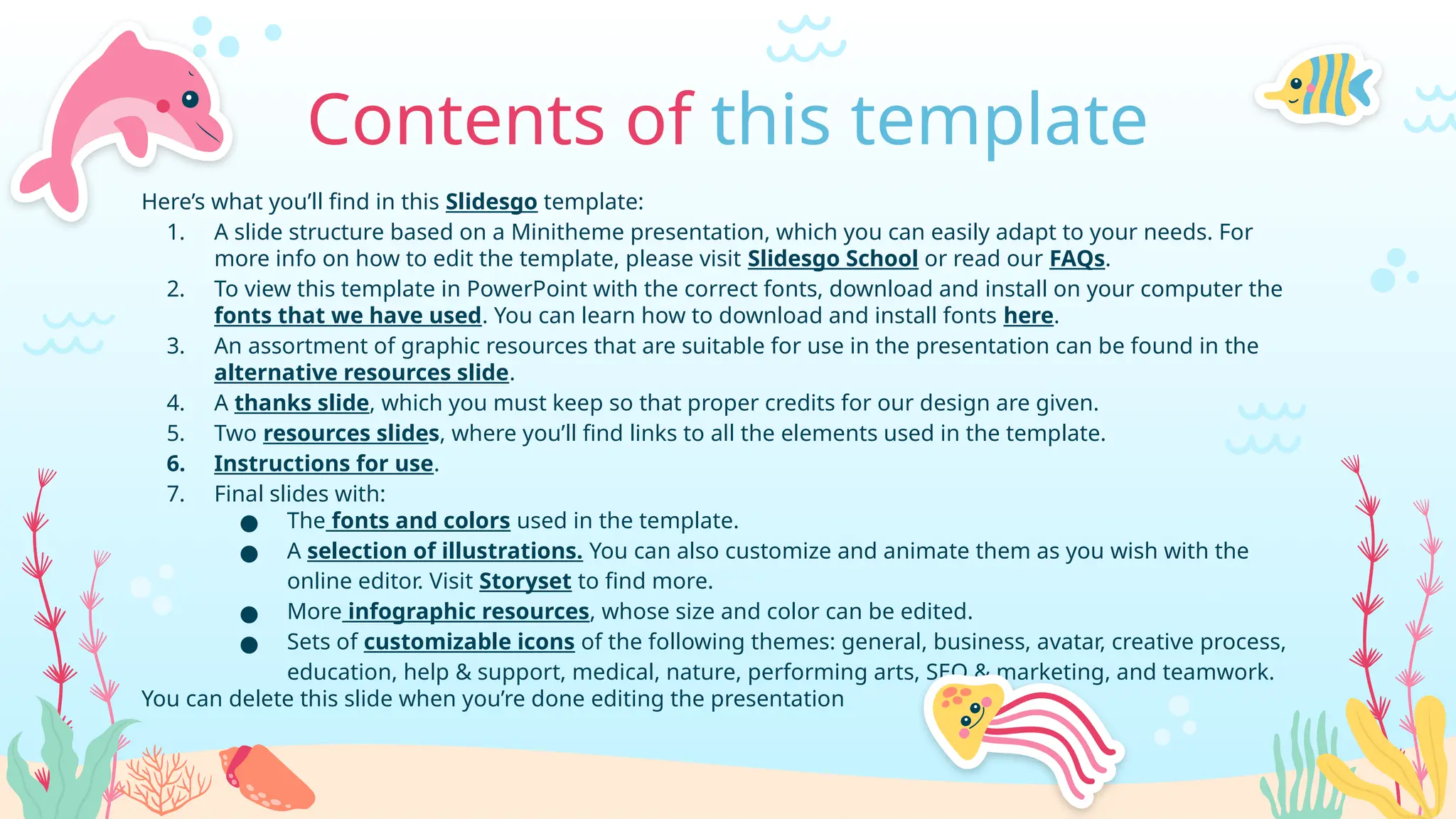 5. Two resources slides, where you’ll find links to all the elements used in the template.