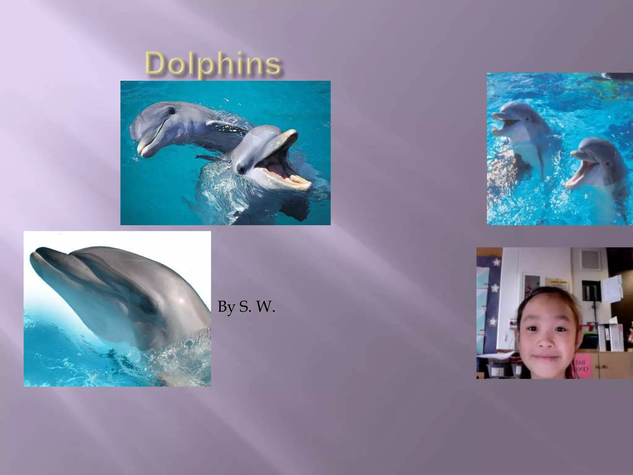 Dolphins are mammals that live in oceans and some rivers. They eat fish like herring, cod, and squid. Dolphins have babies that are born tail first. Sharks, killer whales, and humans sometimes prey on dolphins. The document provides an introduction to dolphins with chapters covering what they are, where they live, what they eat, predators, babies, a poem, facts, and definitions of key words.