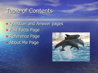 Dolphins live in coastal waters like harbors, bays, and estuaries. They may migrate to follow fish populations or avoid cold water. Dolphins have predators like sharks, but can pretend to be dead to avoid attacks. Bottlenose dolphins are typically 10 feet long and can weigh up to 400 pounds. Dolphins communicate using sounds from their blowholes, rapidly opening and closing them to create squeaks and whistles under water.