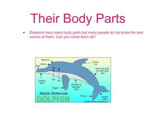 There are over 30 species of dolphins found worldwide. They live mainly in saltwater oceans and seas, though some species can live in freshwater. Dolphin species vary in size, coloration, fin shape, and skull structure. The most common species is the bottlenose dolphin, known for its intelligence. River dolphins live in freshwater habitats in South America and Asia. The rough-toothed dolphin prefers deep waters and lacks a melon crease found in other dolphins. Species identification can be determined by characteristics such as the Risso dolphin's square head or the striped dolphin's blue and white stripes.