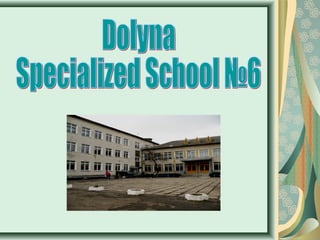 Dolyna Specialized School No6 was founded in 1974 and became specialized in teaching English in 2003. It has 611 students taught by 96 experienced teachers across 24 classes. The school focuses on subjects like foreign languages, maths, and Ukrainian history. It participates in international exchange programs with schools in Canada, Germany, Poland, and Estonia to give students opportunities to learn about other cultures.
