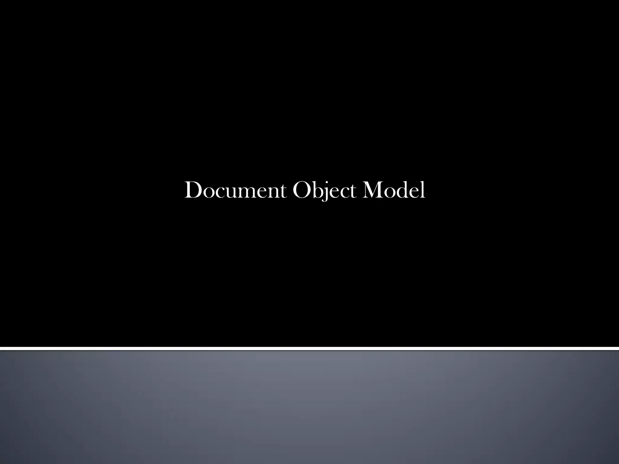 The DOM (Document Object Model) allows programs and scripts to dynamically access and update the content, structure and style of documents. It gives generic access to elements, styles and attributes in a document. The DOM organizes how elements are referenced and interact with each other. Examples show how scripts reference elements, apply styles, and change styles. Different document objects like the document, anchor, button, form, image and event objects are used to access and manipulate HTML and XML documents. The DOM provides a standard programming interface for working with documents across environments and applications.