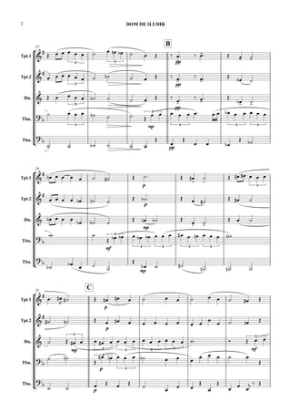 The document appears to be musical notation for a piece entitled 'Dom de Iludir,' involving various brass instruments such as trumpets, horns, trombones, and tubas. It contains dynamic markings and various notational elements indicating tempo and performance instructions. The overall structure includes multiple sections, likely intended for ensemble performance.