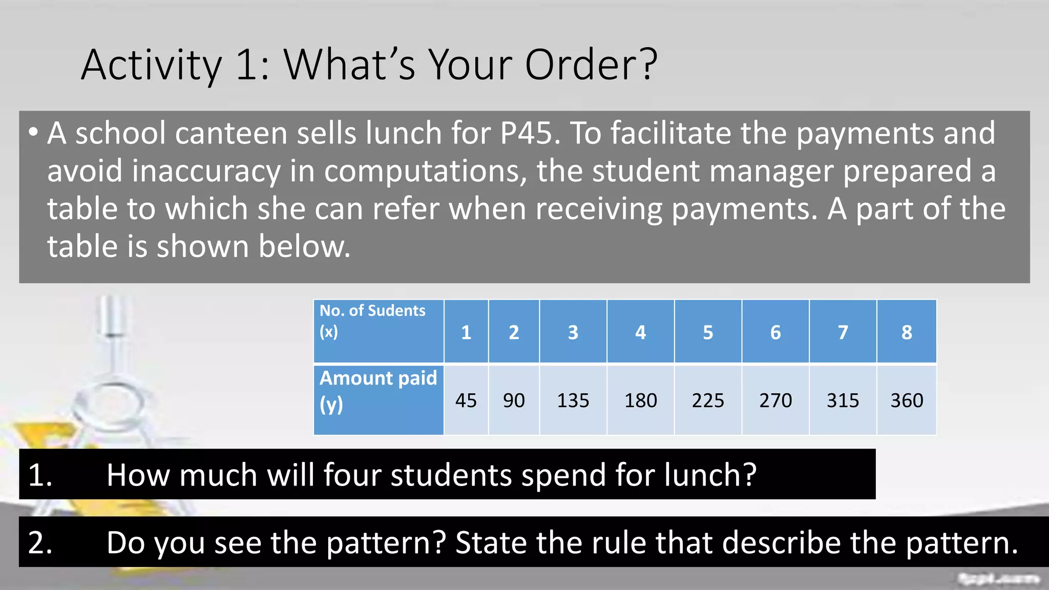 The document discusses domain and range of functions. It defines domain as the set of all first coordinates (x-values) of ordered pairs in a function, and range as the set of all second coordinates (y-values). Examples are provided to demonstrate determining the domain and range from ordered pairs, graphs, and equations defining functions. Key aspects like the domain and range being all real numbers for linear functions are covered. Activities have learners practice finding domains and ranges in various scenarios.