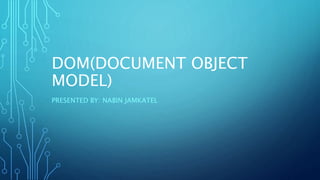The document discusses the Document Object Model (DOM), which defines the logical structure of objects in an HTML document and how they can be manipulated with JavaScript. The DOM represents an HTML document as nodes and objects that can be accessed and modified with JavaScript. All HTML elements, text, and attributes can be accessed through the DOM to be modified, deleted, or have new elements created. Events allow scripts to run in response to user actions on a page.