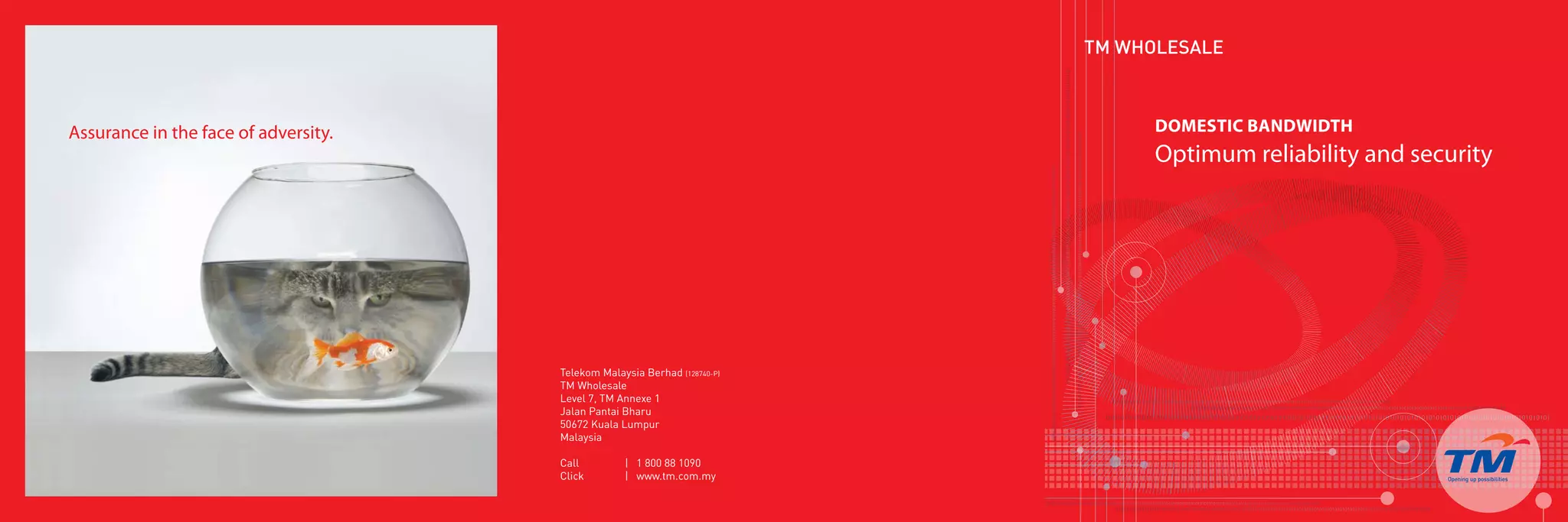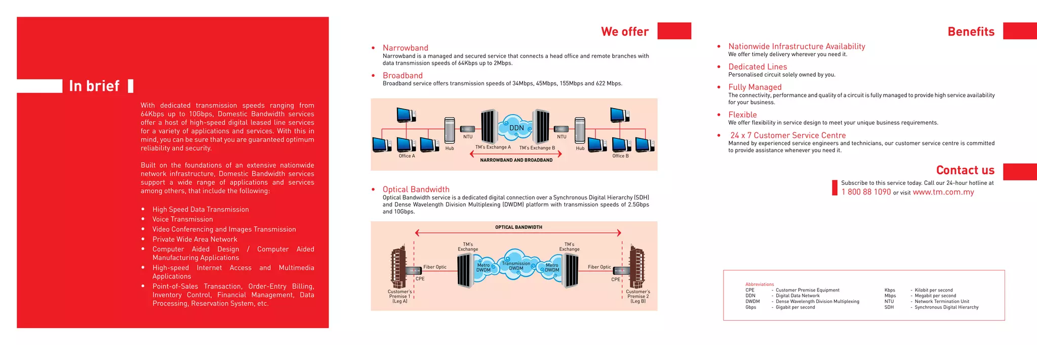 Telekom Malaysia offers domestic bandwidth services for high-speed digital leased lines ranging from 64Kbps to 10Gbps. These services provide optimum reliability and security through TM's nationwide infrastructure. Services include narrowband up to 2Mbps, broadband up to 622Mbps, and optical bandwidth up to 10Gbps. Benefits include dedicated lines, fully managed connectivity, flexibility, and 24/7 customer support.