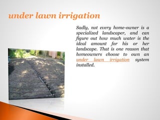 The document discusses the benefits of under lawn irrigation systems, particularly subsurface drip irrigation, which helps homeowners manage water usage effectively. It emphasizes the importance of providing the right amount of water to plants and how an automated irrigation system can prevent overwatering and save costs. Contact information for Gawler Irrigation Pty. Ltd. is also provided.