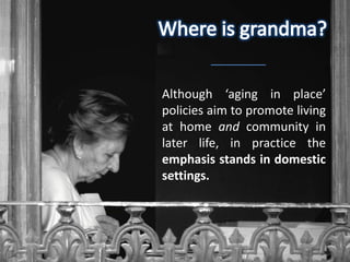 The document discusses the implications of 'aging in place' policies, emphasizing the tension between promoting home life for seniors and their desire for independence, as shown through narratives of older people's experiences with telecare services. It highlights the social and emotional challenges faced by seniors in adapting to telecare devices that reinforce a domestic lifestyle, while they often seek to maintain an active, external life. The analysis reveals a negotiation process where seniors assert their autonomy against the expectations imposed by telecare professionals and the technologies.