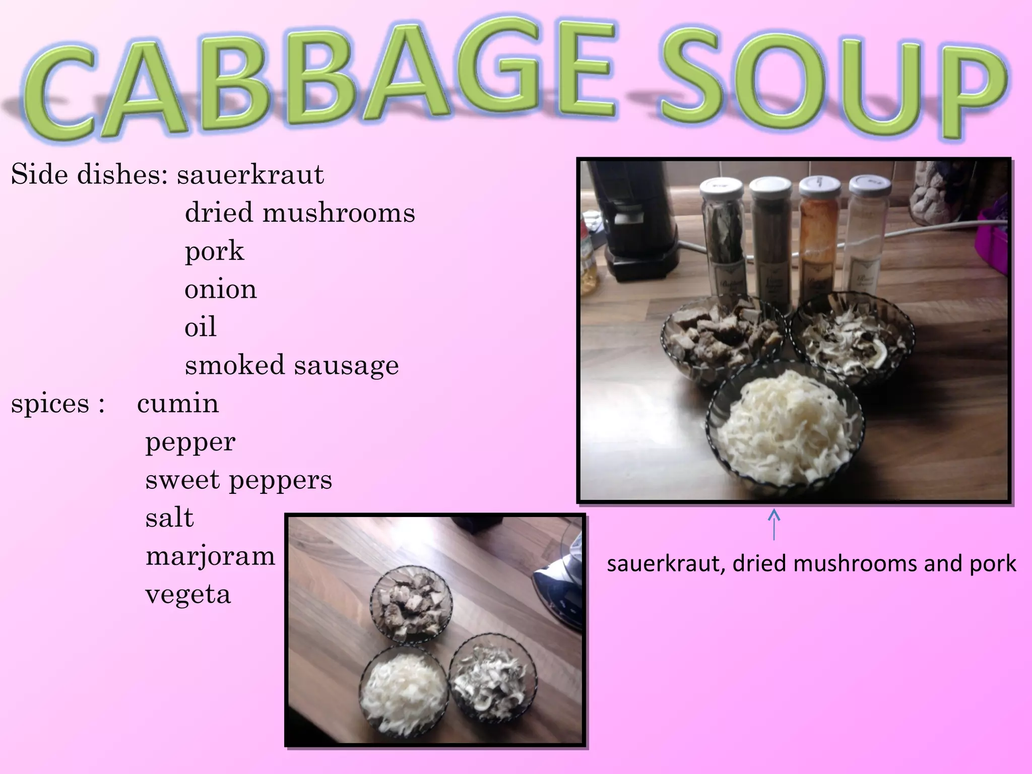 This recipe calls for sauerkraut, dried mushrooms, pork, onion, oil, and smoked sausage as ingredients. The procedure is to fry chopped onion in hot oil until golden brown, then add pork cubes and spices including cumin, salt, vegeta, garlic, black pepper, and marjoram. Water is added and the mixture simmers until the meat is tender. Meanwhile, sauerkraut is cooked with water three times along with smoked sausage and mushrooms. Once the meat is soft, the juices and meat are added to the cooked sauerkraut mixture. It simmers for a few more minutes before serving.