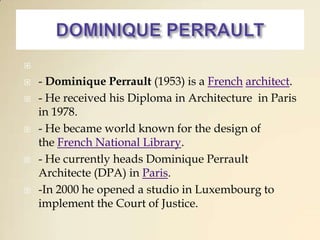 Dominique Perrault is a French architect known for designing the French National Library. He received his architecture diploma in 1978 and now runs his own firm, Dominique Perrault Architecte. One of his notable projects is the Habitat Sky Hotel, a 31-floor building in Barcelona, Spain constructed in 2007. He is also known for designing other structures like the Magic Box in Madrid and Velodrom in Berlin. Current projects include bridges in Palermo, Italy and a university in Seoul, South Korea.