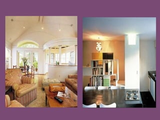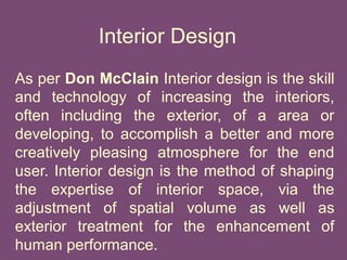 The document provides an overview of interior design principles, emphasizing the importance of meticulous planning and understanding of space to create a pleasing atmosphere. It discusses various components of interior design, including backgrounds (walls, windows, floors, ceilings), furniture selection and arrangement, and the use of accessories and lighting to enhance the space. Key considerations include functionality, style, and the effective use of materials and colors.