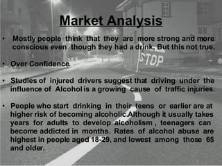 Driving under the influence of alcohol is a growing cause of traffic injuries according to studies. Teenagers are at especially high risk of developing alcoholism if they start drinking early. Rates of alcohol abuse are highest among 18-29 year olds. The legal limit for blood alcohol concentration while driving in India is 30mg per 100ml. If caught driving drunk, punishments include fines and imprisonment. Ignition interlock devices can help prevent drunk driving by requiring the driver to pass a breathalyzer test before starting the vehicle.