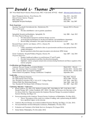 Donald L. Thomas Jr. is a physical therapist seeking new opportunities. He has over 5 years of clinical experience in various settings including acute care hospitals, outpatient orthopedics, skilled nursing facilities, and home health. Thomas has additional experience in physical therapy aide work, research, wellness programs, and volunteer physical therapy. He holds several certifications and has participated in continuing education conferences on topics like stroke rehabilitation and lymphatic therapy. Thomas seeks to apply his strong clinical and evaluation skills to serving geriatric patients.