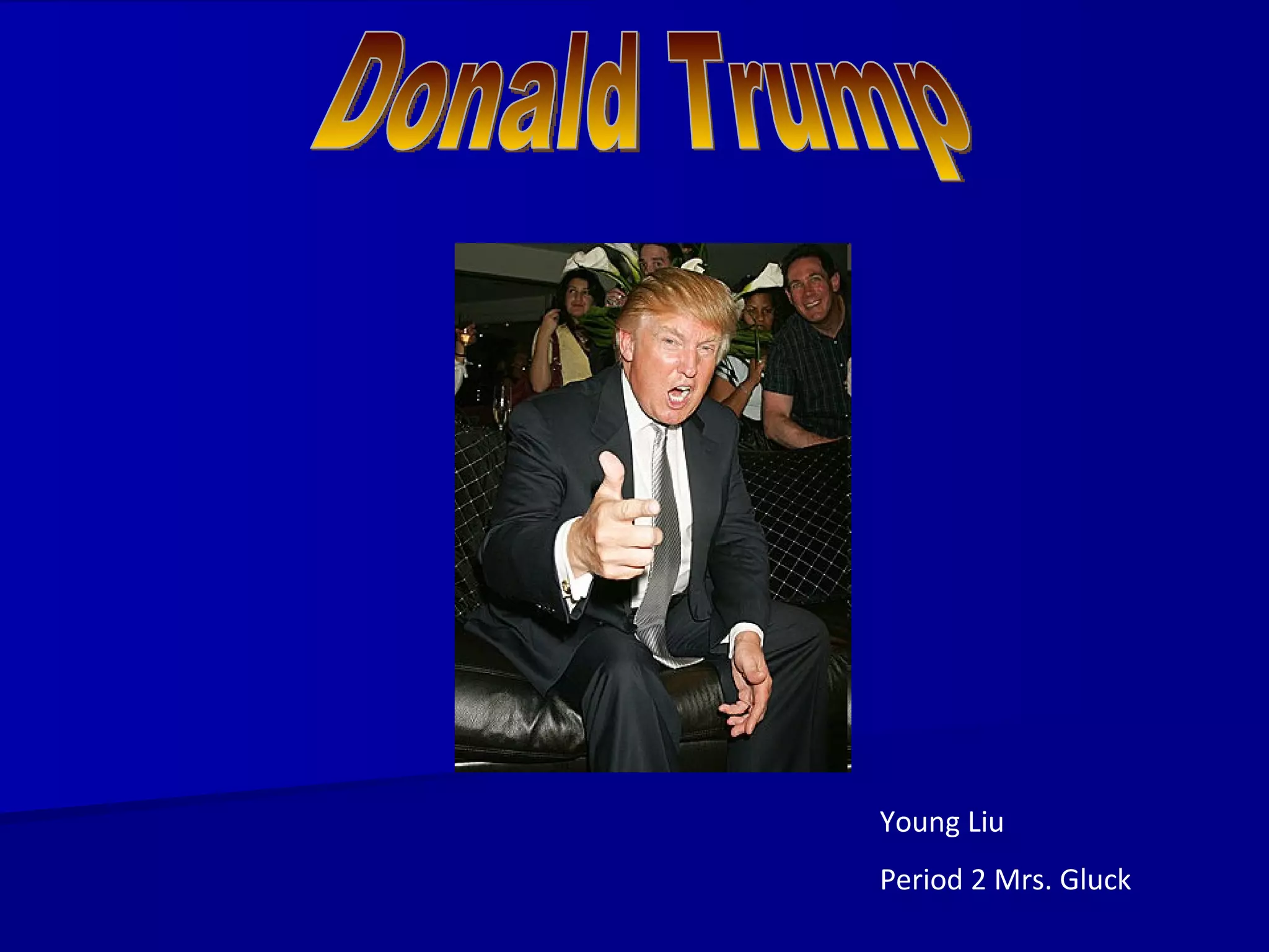 Donald Trump is a businessman, author, and TV personality known for his real estate ventures and reality show The Apprentice. He learned about real estate from his father and has had success developing properties. However, his actual wealth is difficult to determine as he is known to exaggerate. He values his public image and perceived wealth which he believes helps him make deals. Trump also owns the Miss Universe pageants and has had roles in movies and TV shows. He became famous for his catchphrase "You're fired" on The Apprentice.