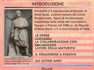 Donatello, scultore italiano del primo rinascimento, nasce a Firenze nel 1386 e muore nel 1466, influenzando profondamente l'arte con le sue opere realistiche e innovative. Tra le sue creazioni più celebri ci sono il David bronzeo, il monumento equestre del Gattamelata e la Maddalena lignea, che evidenziano la sua abilità nel coniugare classicismo e emozione umana. La sua tecnica innovativa, come lo 'stiacciato', e il suo approccio alla scultura influenzarono generazioni di artisti successivi.