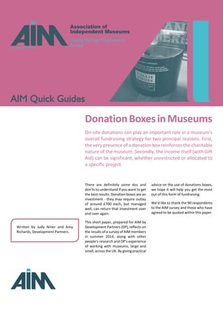 Independent Museums Association provides guidance on optimizing donation box fundraising. They recommend using transparent Perspex boxes placed at entrances and exits to encourage donations by allowing people to see money already donated. Boxes should have clear signage explaining the charitable nature and funding needs of the museum. Regularly updating visible cash floats and tracking donations helps increase amounts given. Encouraging staff and volunteers to promote donation boxes can significantly boost intake. Claiming Gift Aid and the Gift Aid Small Donations Scheme can further increase funds raised through on-site donations.