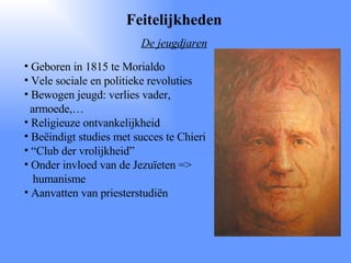 Feitelijkheden De jeugdjarenGeboren in 1815 te Morialdo Vele sociale en politieke revoluties Bewogen jeugd: verlies vader, armoede,… Religieuze ontvankelijkheid Beëindigt studies met succes te Chieri “ Club der vrolijkheid” Onder invloed van de Jezuïeten => humanisme Aanvatten van priesterstudiën
