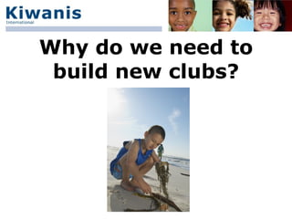 This document provides guidance on building new Kiwanis clubs. It discusses that new clubs are built to serve more children in more places by filling community needs and providing fellowship and service opportunities. However, many new clubs from 2000-2001 failed within a few years. The key reasons for failure were being too small, lacking initial service projects and funds, and not properly training members. The document then provides a 7 step process to build successful new clubs with recruiting targets and timelines. The process involves forming a new club team, surveying the community needs, connecting with community leaders, recruiting at least 25 members, organizing the club, educating and training members, and providing ongoing support and mentoring.