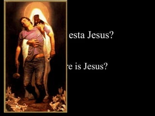 The document asks repeatedly where Jesus is located, questioning if he is at home, on the street, at school, with friends, with church, or with holy sacraments.