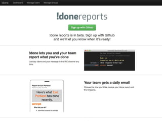 The document outlines the development of an IRC bot, called !done, designed to enhance team communication and status reporting for distributed teams. It describes the bot's functionality, including daily summary emails, user management challenges, and suggestions for usage. Additionally, it highlights the bot's architecture and modular nature, inviting attendees to sign up for a beta trial.