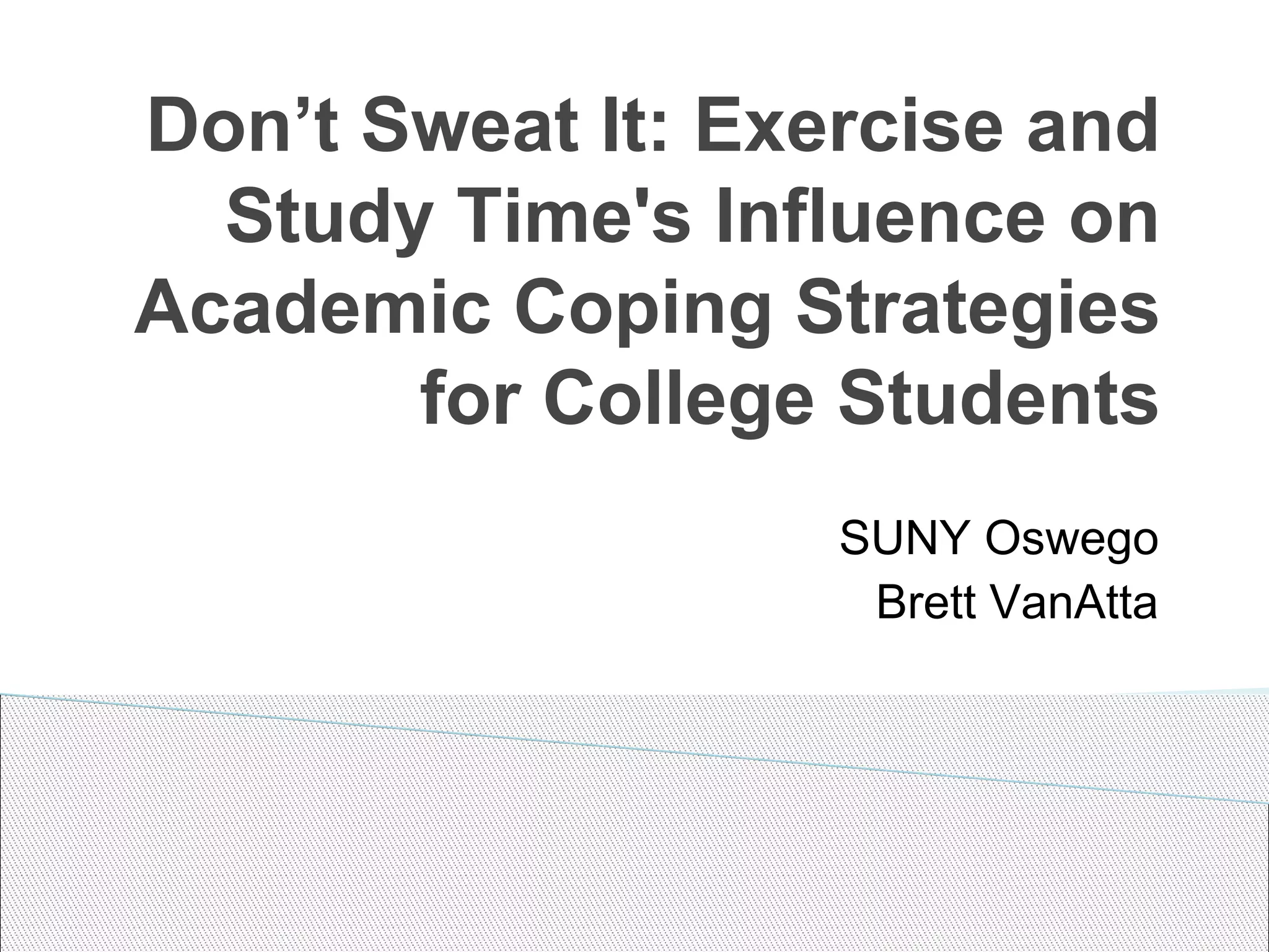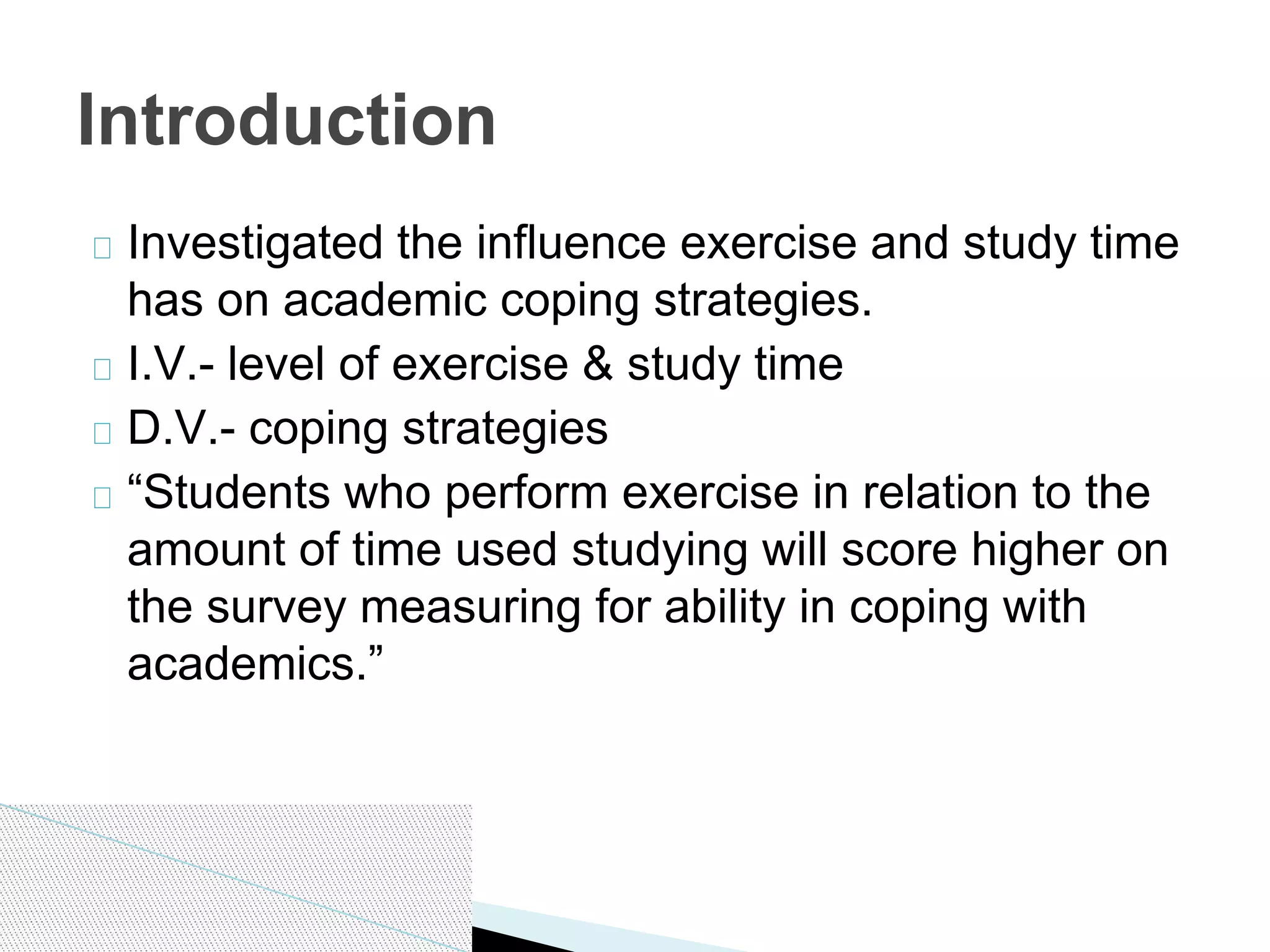 This study investigated the influence of exercise and study time on college students' academic coping strategies. Seventeen undergraduate students reported their weekly exercise and study hours, then completed a survey measuring coping abilities. Results found no significant main effects of exercise or study time on coping scores, and no significant interaction between exercise and study time. While exercise did not correlate with coping strategies in this study, it confirmed that individuals use various coping methods for academics. The study could be improved with a larger, more diverse sample size and alternative independent variables.