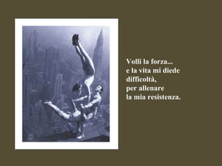 Il documento esplora il concetto che le sfide e le difficoltà siano strumenti per ottenere forza, saggezza e prosperità. Sottolinea come le esperienze della vita, anche se non corrispondono sempre ai desideri, forniscano lezioni preziose per la realizzazione personale. Alla fine, enfatizza l'importanza di riconoscere e apprezzare i doni della vita.