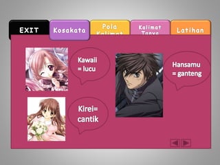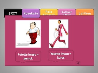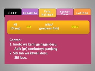 Dokumen ini membahas penggunaan kata 'dan' dalam bahasa Jepang. Kata 'dan' digunakan untuk menghubungkan kata sifat yang diakhiri dengan huruf tertentu. Contoh penggunaannya dijelaskan dalam konteks kata sifat 'omoshirokute' dan 'kirei de'.
