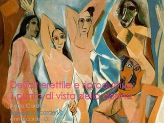 La disfunzione erettile e l'incapacità riproduttiva influenzano negativamente la qualità della vita e l'identità sessuale dei partner, portando a sentimenti di colpa, frustrazione e conflitti relazionali. Le donne possono vivere la difficoltà del partner come una minaccia alla propria autostima, generando distacco emotivo e disinteresse sessuale. Supporto psicologico e sessuologico è fondamentale per affrontare questi problemi e mantenere una comunicazione aperta nella coppia.