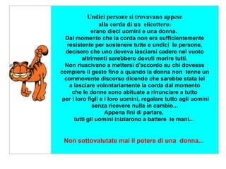 Il documento racconta varie storie con un forte messaggio umoristico sulle differenze tra uomini e donne. Attraverso aneddoti e battute, emerge il potere e l'intelligenza delle donne, evidenziando come spesso gli uomini non ascoltino. Si conclude con una riflessione sul raggiungere un equilibrio nella relazione tra i sessi e sulla difficoltà di trovare uomini che comprendano l'umorismo femminile.