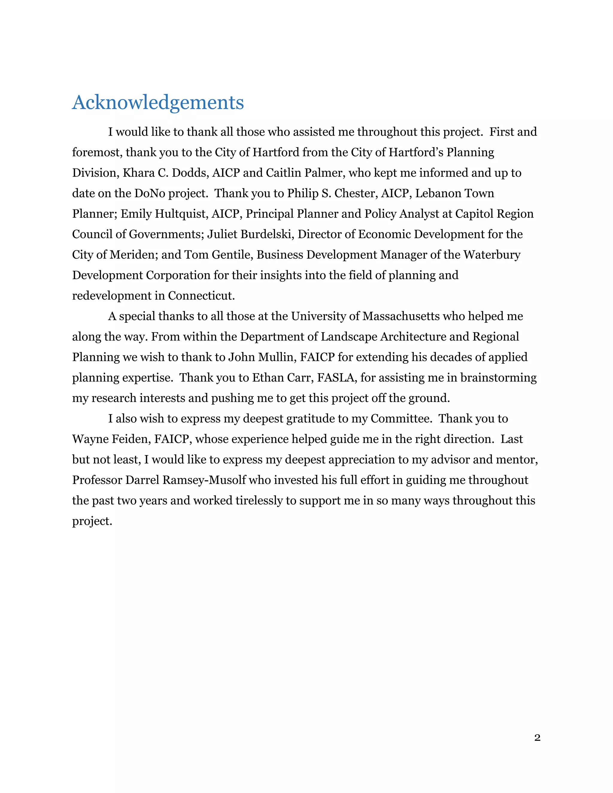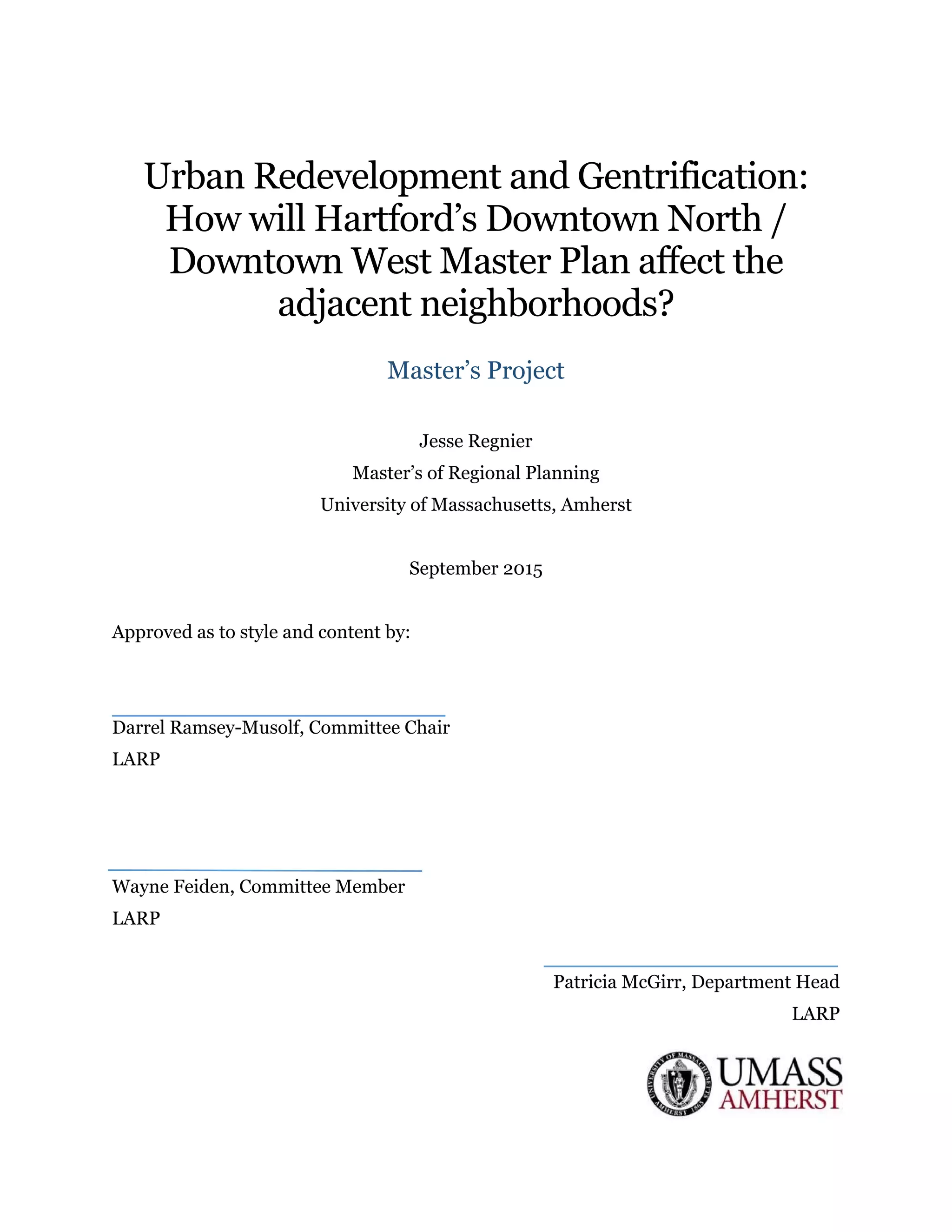 This document summarizes a master's project analyzing how Hartford, Connecticut's Downtown North/Downtown West Master Plan may affect surrounding neighborhoods. It includes an analysis of existing socioeconomic conditions in the neighborhoods, a review of literature on gentrification and housing policy, a summary of the master plan, analysis of redevelopment proposals for two areas prioritized in the plan, and rubrics comparing Hartford to case studies of redevelopment in Waterbury and Meriden, Connecticut. Recommendations are provided to address potential gentrification impacts.