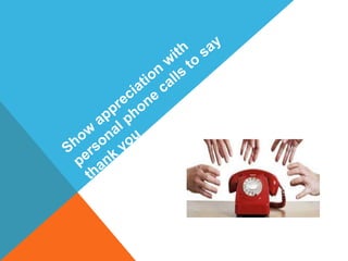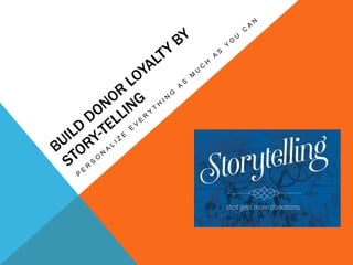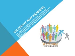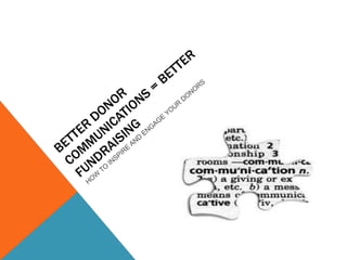 The document provides guidance on how to celebrate and engage with new donors through a welcome package and ongoing communication. It recommends sending a thank you letter, welcome newsletter, and donor survey to collect preferences. It also suggests creating a donor calendar, developing a communication plan, and emphasizing storytelling to show donors how their donations are making an impact. The goal is to build strong relationships and encourage repeat donations through personalized, multi-channel engagement.