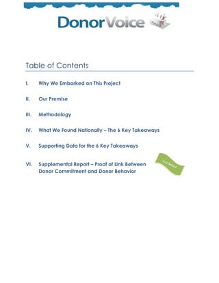 This document provides a summary of a report on measuring donor commitment levels. Some key findings: