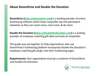 This document provides instructions for nonprofits using Donordrive to integrate the Double the Donation employee matching gift plugin into their fundraising efforts. It details the steps to create matching gift pages and modify donation thank you screens to include matching gift information, as well as how to add resources for fundraisers. The document also includes links for further support and resources related to Double the Donation's services.