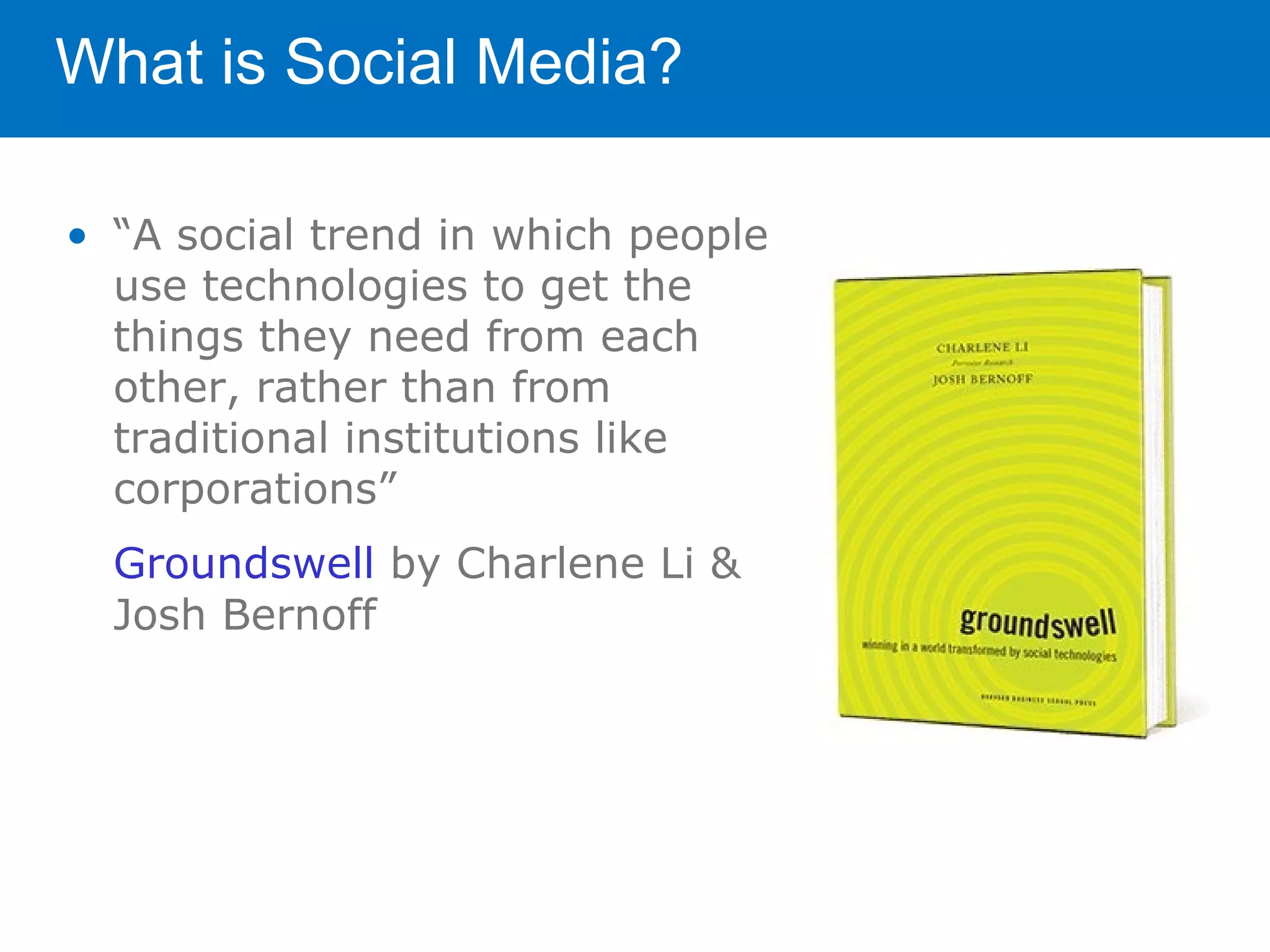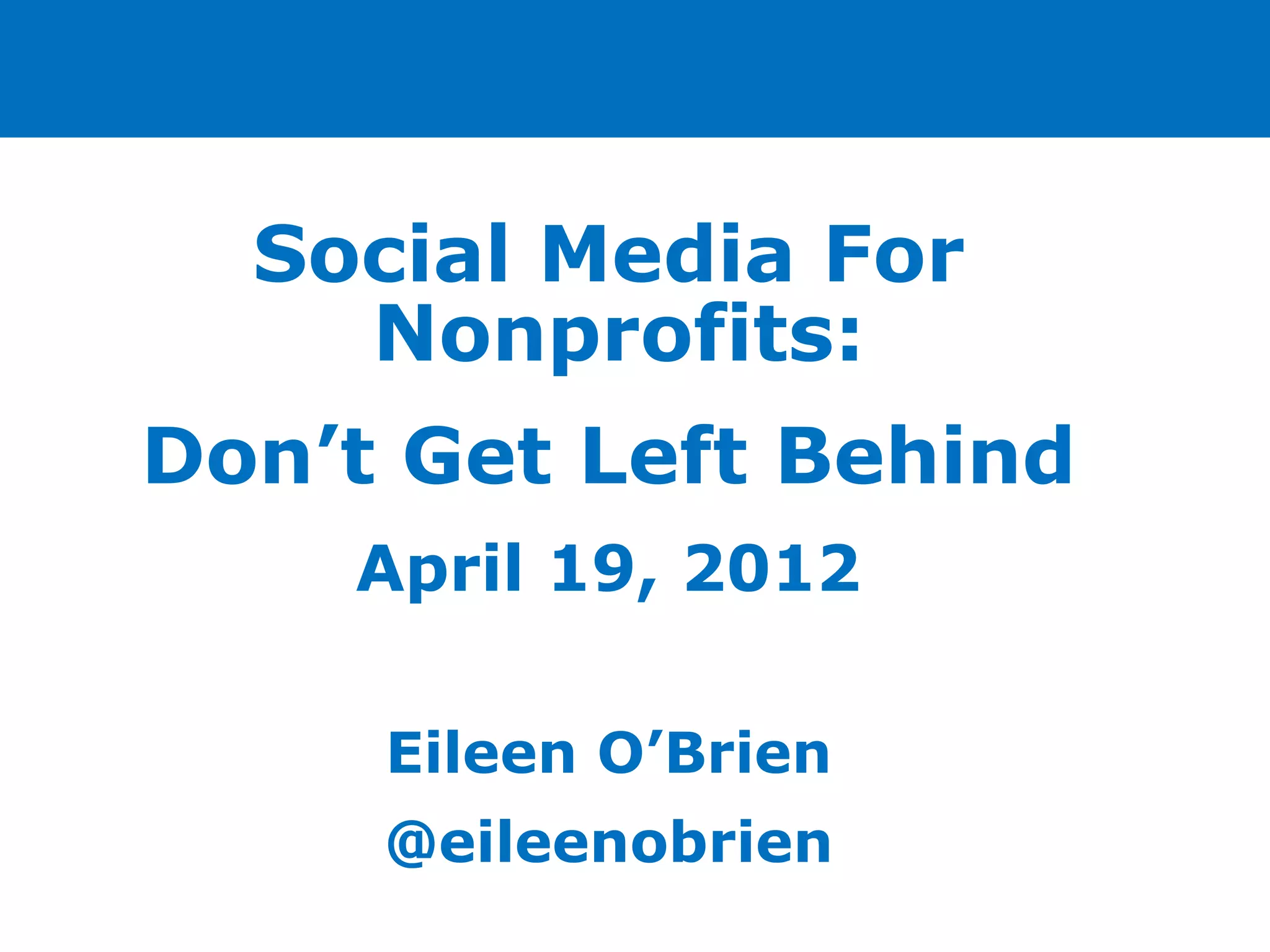 The document provides an overview of how nonprofits can utilize social media. It discusses that social media is a tactic that should be integrated into an organization's overall marketing strategy and objectives. It also recommends starting on key platforms like Facebook, Twitter, YouTube and blogs in order to engage supporters and spread awareness of the nonprofit's mission. Additionally, the document emphasizes the importance of listening to supporters and adding value through social media in order to build relationships and promote the organization's work.