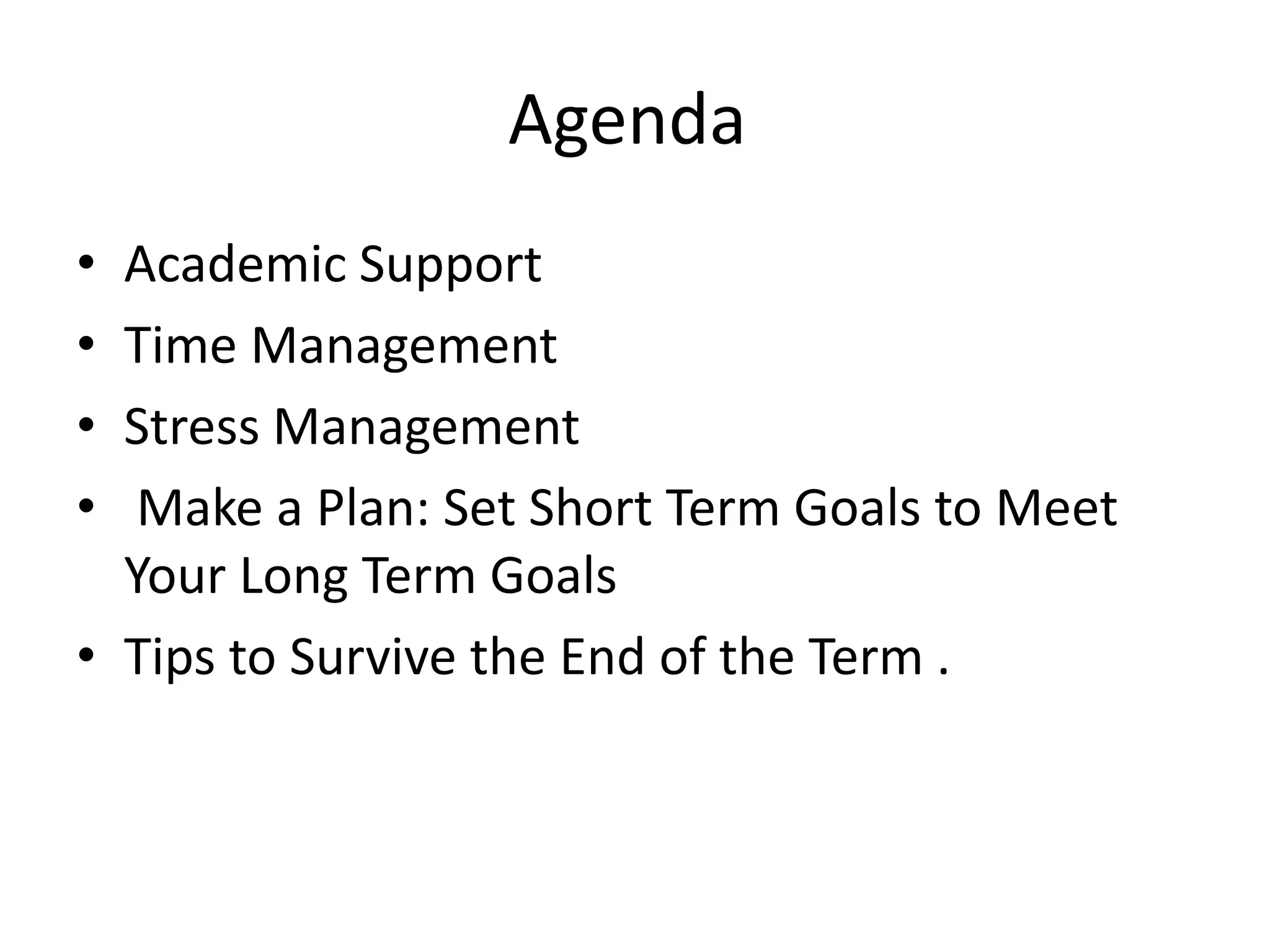 This document outlines various academic support services and resources available to students, including personalized coaching, workshops, and online tutoring options. It emphasizes effective time management, stress management strategies, and goal setting to help students succeed academically. Additionally, it provides specific tips for studying and prioritizing tasks while highlighting the importance of self-care during the academic term's end.