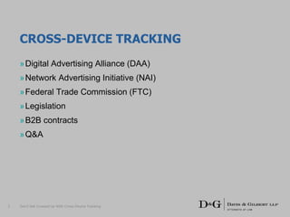 The document discusses cross-device tracking in digital advertising, emphasizing the importance of transparency and consumer control through self-regulatory principles established by entities like the Digital Advertising Alliance (DAA) and the Network Advertising Initiative (NAI). It highlights legal considerations, enforcement actions by the FTC, and specific case studies addressing privacy and consumer rights in tracking practices. Legislative measures aimed at enhancing consumer privacy, such as the 'Do Not Track Online Act' and the Illinois Right to Know Act, are also addressed.