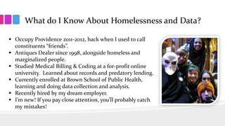 This document discusses challenges with collecting accurate and complete data in Homeless Management Information Systems (HMIS). It notes that data quality is influenced by many personalities, including clients, end users entering data, and the variables themselves. Specific issues are discussed for variables like name, social security number, date of birth, race, gender, disability status, income, and housing status. Accuracy depends on properly training staff on interview techniques, understanding skip patterns and response options, and updating records over time. The document emphasizes that while data is used for important purposes, the limitations of self-reported data from a hard-to-reach population must also be acknowledged.